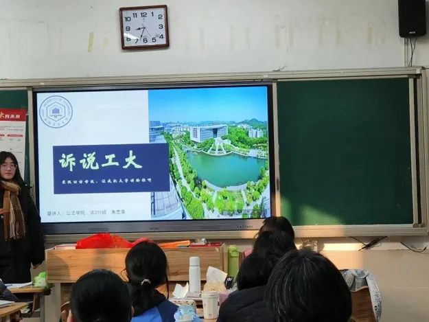 的环境优美宜人,照片上的四季美景和安工大的标志性“打卡点”引来了学弟学妹的阵阵欢呼声,讲台下有学妹发自肺腑地表示:“安工大的白桦林好美啊”。其次,我还向他们介绍我校优质齐全的硬件条件、新鲜可口且种类多样的饭菜、整洁宽敞且温馨的宿舍环境、完备先进的教学设施,学弟学妹看到一张张美食照片呈现在PPT上,不禁发出“哇塞”的感慨,我想他们是在感慨工大的美食“色香味俱全”啊。并且我通过一系列活动组图向无为中学的学弟学妹们介绍我校学子丰富多彩的课余生活,以此展现安工大学子阳光朝气的精神风貌。同时结合我自身当时面临的困难和茫然,指出他们现阶段学习过程中可能会产生的问题,并分享自己高三的经历和一些自己的学习见解。最后,表达对学弟学妹2024年高考大捷、金榜题名的祝福,也再次表示欢迎学弟学妹报考51视频