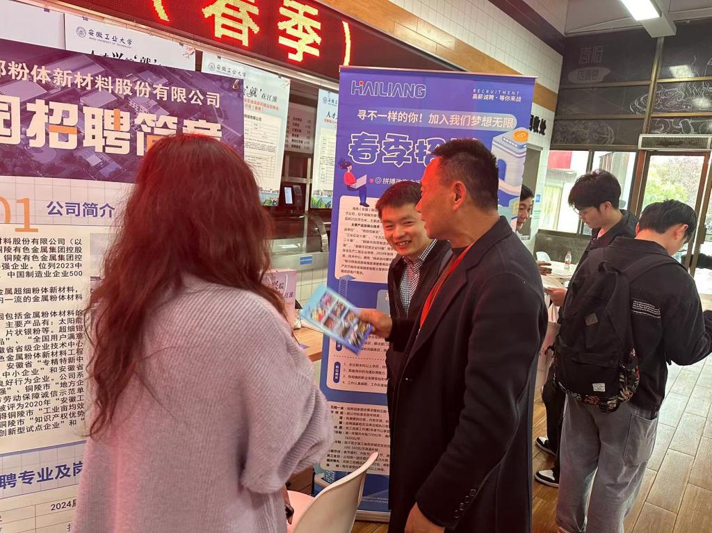 招聘会现场,胡正友、周浩然一行先后走访铜陵四通环境科技有限公司、铜陵金泰化工股份有限公司、安徽美芯新材料有限公司、铜陵贝斯美科技有限公司、海亮(安徽)铜业有限公司等近20家企业,各企业负责人就企业的发展状况、产品研发、人才需求等方面的情况进行了介绍,胡正友认真了解企业用人需求,向企业介绍了51视频