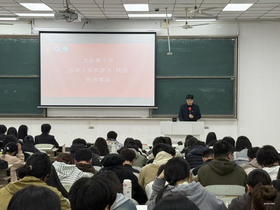 钱前发表闭幕词宣告本次大会圆满结束,对大会的成功举办表示祝贺,并对所有参与者的辛勤付出给予高度肯定,并希望新一届学生组织成员牢固树立为青年服务意识,认真履职,秉持朝气蓬勃、锐意进取的担当精神,团结并引领全院青年学子以青春之志汇入实现中华民族伟大复兴中国梦的壮阔实践,脚踏实地、奋勇争先,不惧艰难、勇往直前,为学校发展与学院建设贡献更多青春力量。