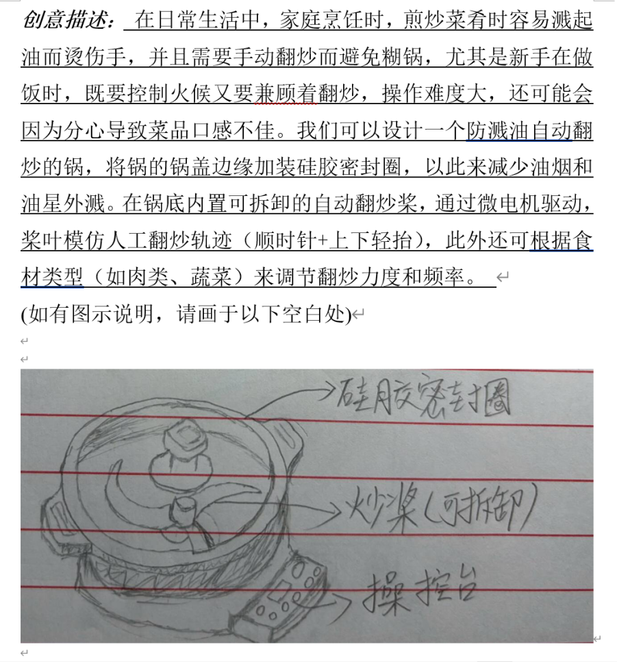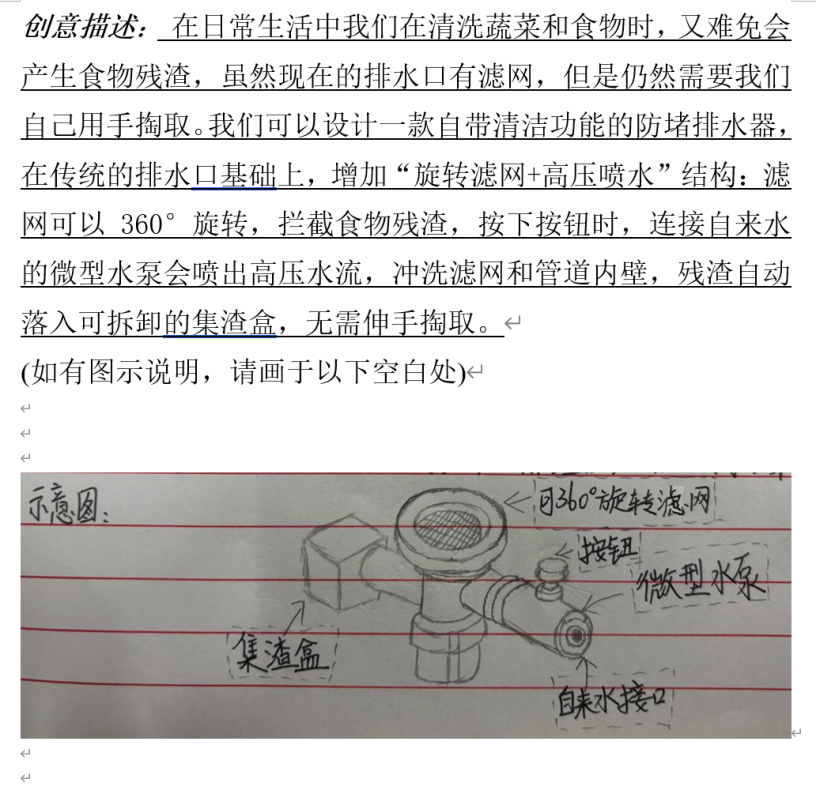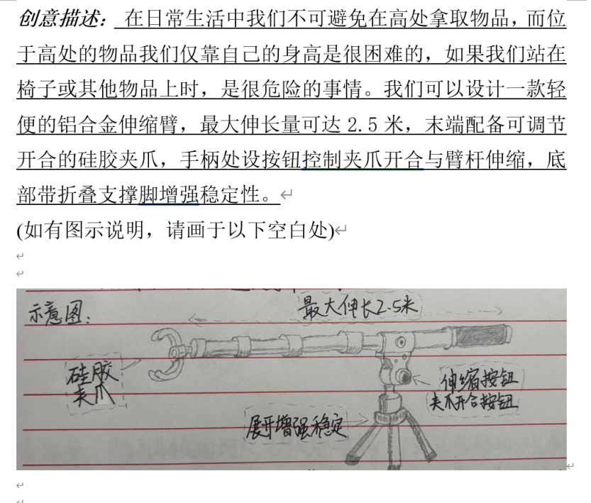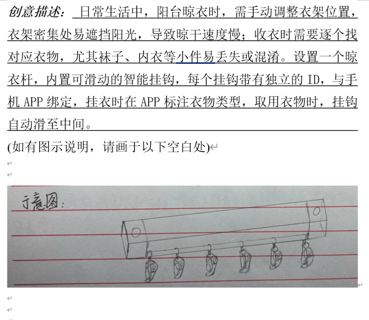 活动期间,参与人员或通过文字记述的形式,围绕具体内容、应用场景、潜在价值等对创新设想进行准确清晰的阐述;或采用图形呈现的方法,通过绘制设计草图、功能示意图并辅以文字标注的形式对创新设想进行直观形象的展现。在活动中,每位学生都充分发挥自我想象力,针对社会性、生活性与学习性等问题,提出创新性解决构想,积极为便利化、创新化的生活贡献出自己的小巧思,成功践行了活动初心。