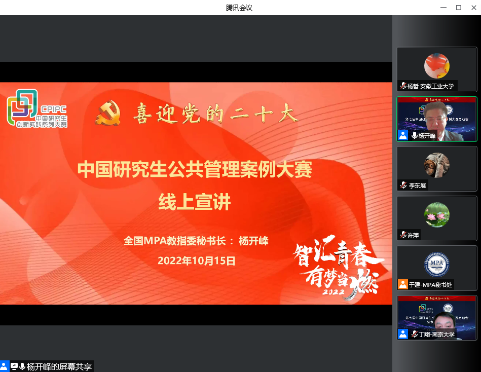 2022年10月15—16日,全国公共管理专业学位研究生教育指导委员会举办第七届中国研究生公共管理案例大赛启动会暨参赛培训会,会议采取线上会议与云端直播同步的形式召开。