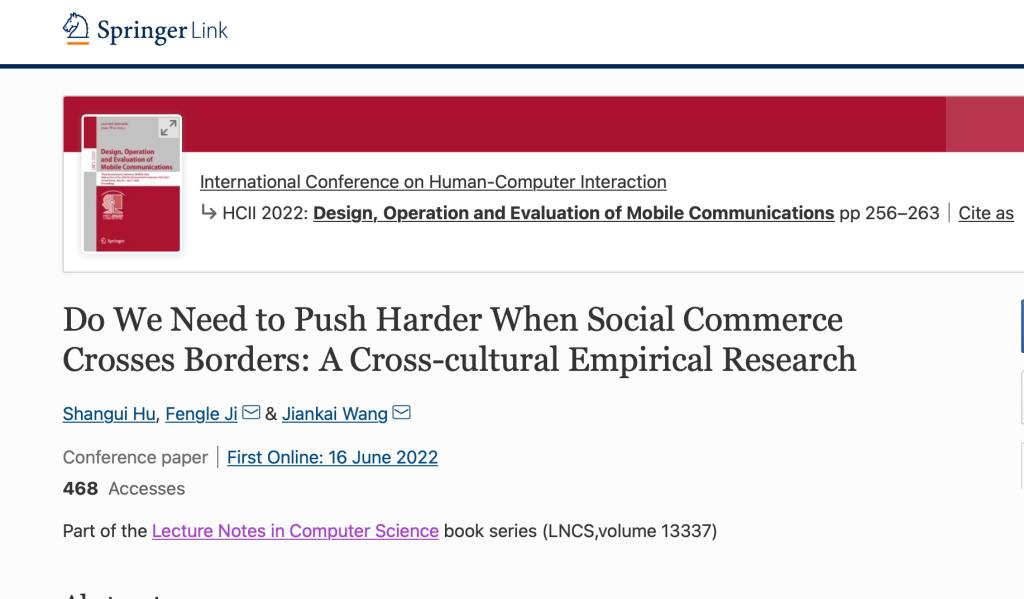王建凯同学在 HCII 2022在线发表最新研究成果 “Do We Need to Push Harder When Social Commerce Crosses Borders: A Cross-cultural Empirical Research”(//link.springer.com/chapter/10.1007/978-3-031-05014-5_21)。胡善贵副教授为第一作者,我校为第一单位,通讯作者为51视频