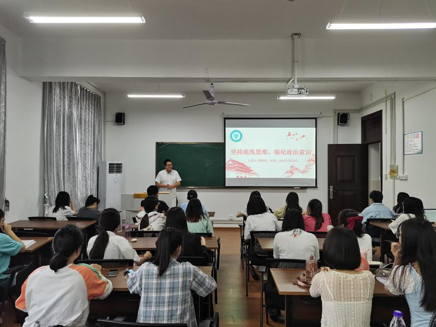 会上,邢老师指出,本次会议旨在强化团支书的底线思维和政治意识,并从坚守“疫情防控底线”、“考试诚信底线”、“发布言论底线”、“宿舍安全底线”等方面进行了阐述。他特别提醒:作为学生干部,一定要坚守做人做事的底线。他通过剖析校内外反面案例,告诫在座同学要自觉遵守学校疫情防控规定,维护校园安全稳定;要以大学生诚信教育主题活动和考试诚信教育为契机,加强班级同学考风考纪教育,坚守诚信考试底线;要关注班级同学思想动态,坚持正确思想观念,不发表、不转发不当言论;要以学生安全主题教育系列活动为契机,加强宿舍安全管理,认真排查违规电器,确保宿舍用电安全。