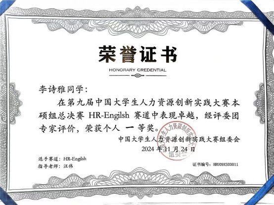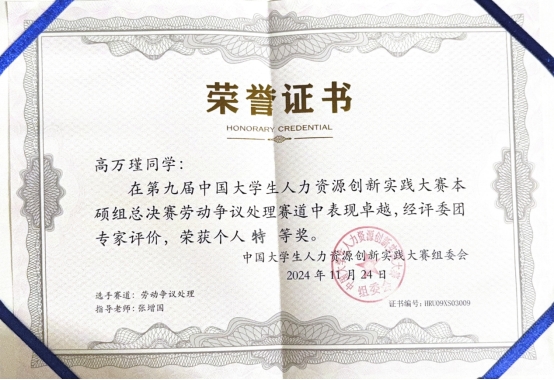 代表队以中东片区赛一等奖的成绩进入全国总决赛,是进军全国总决赛的唯一一支安徽省高校代表队,其中高万瑾同学和李诗雅同学凭借扎实的专业知识、严谨的分析答辩、出色的临场表现,分别在劳动争议处理赛道和HR-English赛道获得个人特等奖和一等奖的好成绩。