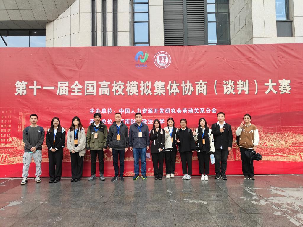 2023年11月3日至5日,第十一届全国高校模拟集体协商(谈判)大赛在河南财经政法大学举办。大赛由中国人力资源开发研究会劳动关系分会主办、河南财经政法大学公共管理学院承办,来自全国各地的35所高校70支代表队,近300选手参赛,大赛邀请了来自政府、工会、企业和高校等不同系统的24位知名劳动关系专家担任评委。人力资源和社会保障部劳动关系司副司长刘燕、中国人力资源开发研究会常务副会长兼秘书长胡继申、河南财经政法大学副校长张扬等出席开幕式致辞并莅临现场指导。